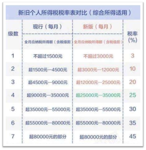 ????????3%、10%、20%三檔低稅率級距擴(kuò)大,25%稅率級距縮小,30%、35%、45%三檔高稅率級距不變。預(yù)測經(jīng)過本次個稅改革后,中等及以下收入群體稅負(fù)下降明顯。