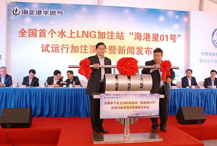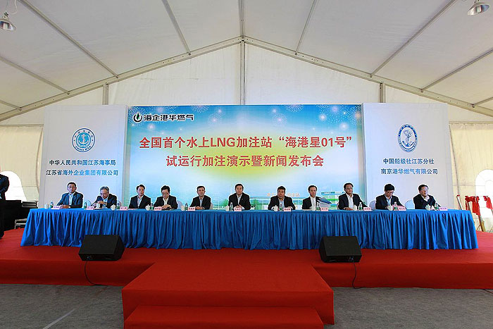 ????????9月26日下午,和風(fēng)旭日、萬(wàn)里無(wú)云。由江蘇海事局、中國(guó)船級(jí)社江蘇分社、江蘇省海外企業(yè)集團(tuán)有限公司、南京港華燃?xì)庥邢薰竟餐鬓k,江蘇海企港華燃?xì)獍l(fā)展有限公司承辦的全國(guó)首個(gè)水上LNG加注站——[海港星01號(hào)]試運(yùn)行加注演示暨新聞發(fā)布會(huì)在南京順利舉行。省政府史和平副省長(zhǎng)、國(guó)家交通部海事局李世新副局長(zhǎng)、以及省政府辦公廳、省國(guó)資委、省發(fā)改委、省經(jīng)信委、省交通廳、江蘇海事局、省能源局和南京、泰州兩市政府相關(guān)部門(mén)的領(lǐng)導(dǎo)出席了本次活動(dòng),海企集團(tuán)和海企技術(shù)公司領(lǐng)導(dǎo)班子全體人員也一同參加了活動(dòng)。本次活動(dòng)由江蘇海事局王士明副局長(zhǎng)主持。
